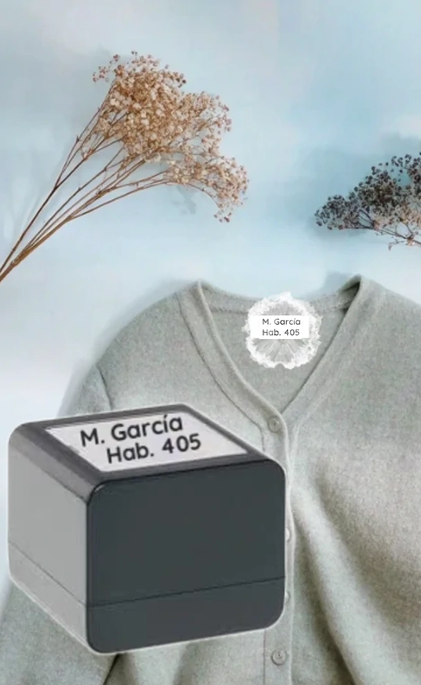 Incluye texto personalizado (nombre, apellidos, habitación, nombre del centro…) para identificar todas las prendas y pertenencias en segundos.